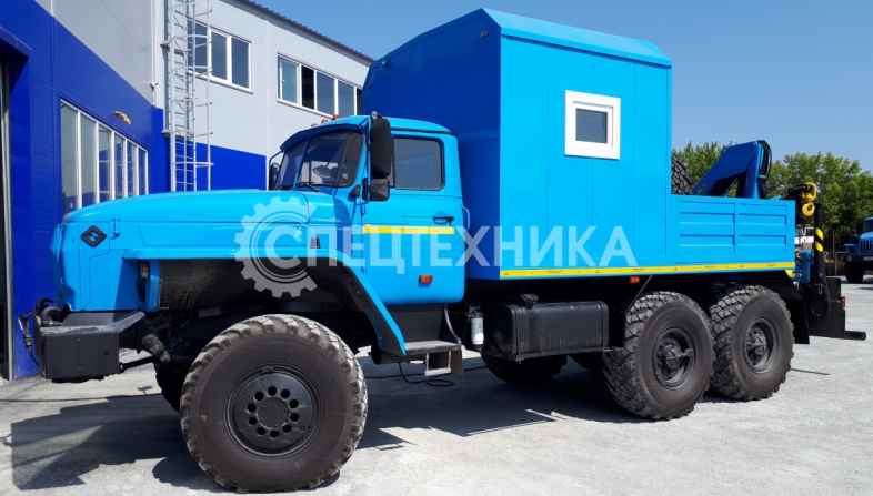 На заднем свесе автомобиля Урал ПАРМ установлен кран-манипулятор ИМ-25, обеспечивающий проведение грузоподъемных работ с весом до 0,99 тонн.