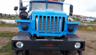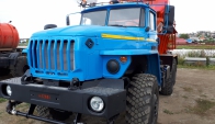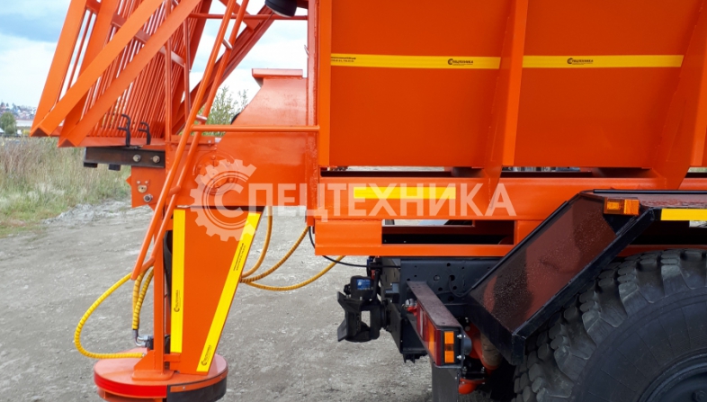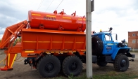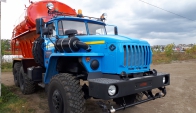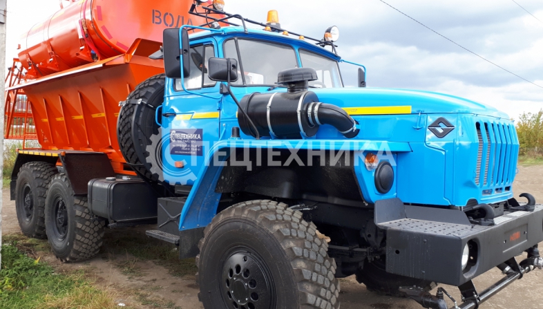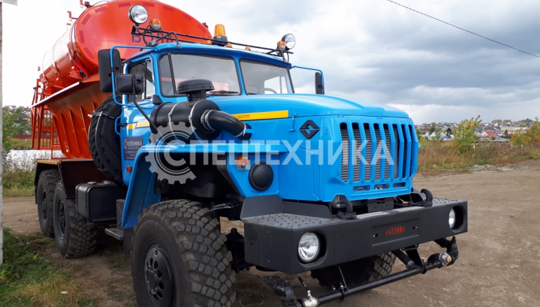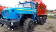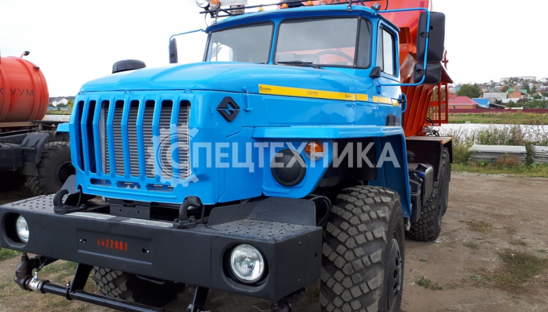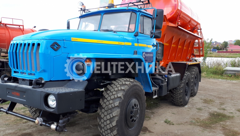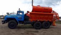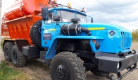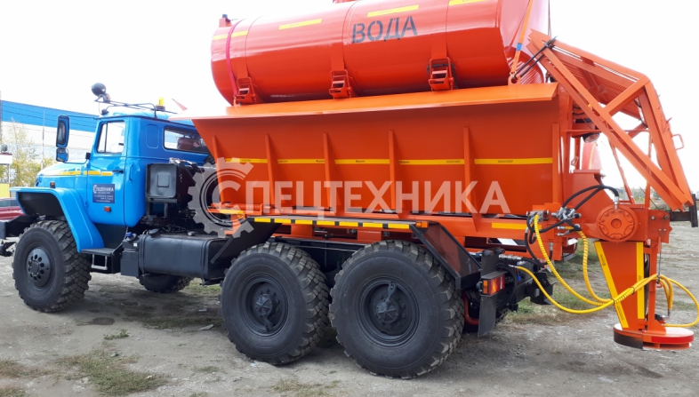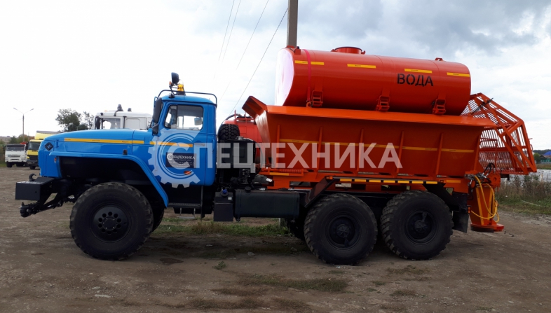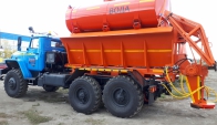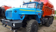 Машина уборочная универсальная 54854 на шасси Урал 6х6. Механизм подачи противогололёдной сыпучей смеси (песка) и вращение диска пескоразбрасывателя имеет регулируемый (посредством магистральных дросселей) гидравлический привод с управлением из кабины водителя.