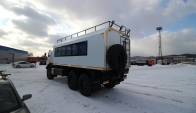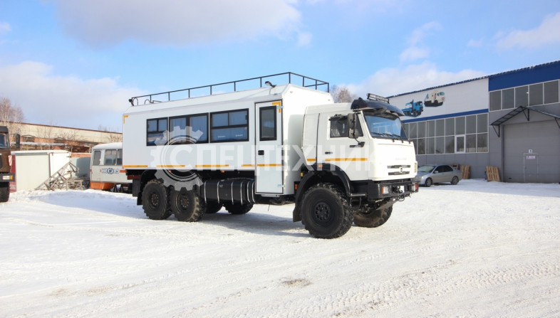 Вахтовый автобус КАМАЗ 43118-50с колесной формулой 6х6 оборудован кузовом-фургоном, предназначен для оперативной доставки рабочих (ремонтных, строительных, геолого-разведывательных и т.п.) бригад в количестве от 20 человек на объект.